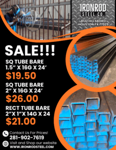 At Ironrod Steel Co., we’re committed to offering the best quality steel at unbeatable prices! Right now, we have a special deal on square tubing—perfect for your fencing, gates, and metal fabrication projects. Take advantage of these limited-time prices while supplies last!